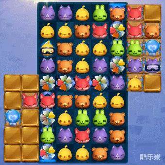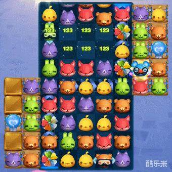 3、本关的步数并不多,有机会还需尽量多的连取特殊棋子,并将它们进行组合使用。利用特效组合的大范围消除,可以大面积的消除太妃糖,并给五叶花花瓣染上其它四种颜色。此外,还能较为容易的改变蓝色电灯泡旁边的棋子布局,获得更多机会给五叶花染上蓝色。