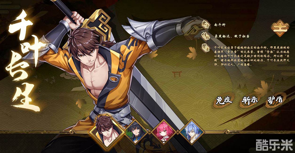背景:千叶长生出身于镇魂街南区的南斗街,那里是特殊的雇佣军“贪字营”的大本营。首领“贪狼”认为他悉心栽培的千叶长生还是缺少世间的阅历,所以将“巨阙”赠与他并派遣他出去四处游历,千叶长生侠肝义胆,胆识过人,广结善缘。