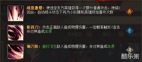 他的普攻技能是“斩首刀”,能向正面的敌人发动攻击并对其造成大量物理伤害。这个技能使用后有一定的概率可以触发7连击并使敌人陷入击退状态;追打技能是“拖刀技”,能追打浮空敌人造成伤害并陷入击退状态中。