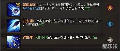唐流雨的绝招为“暴雨梨花”,这一招威力巨大,可以对敌方阵营的任意3个敌人造成186%法术攻击的金系伤害,并使他们浮空。他的普通招式为孔雀翎,能对正面敌人造成物理伤害并使之浮空。如果他能够在攻击敌人时进入追打状态,那么他还可以使用相应的击打技能,对敌人造成追加伤害。