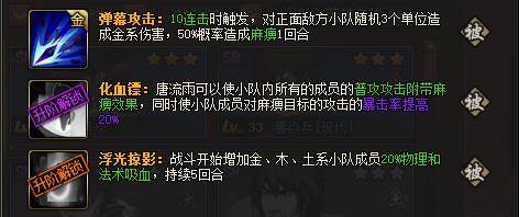 相对于其他英雄,唐流雨的被动技能比较特殊。可能是因为他擅长使用暗器,所以他的被动技能的增益效果都和暗器相关。“弹幕攻击”是他的基础被动技,可对敌方阵营的随机3个敌人做出攻击,造成金系伤害,并有50%的概率麻痹对方一个回合。值得注意的是,这一技能需要他在战斗中达成10连击才可触发。“化血镖”是唐流雨第一次升阶时解锁的被动技,可以使小队内所有成员的普通攻击附带麻痹效果,同时使小队成员对麻痹目标的暴击率提高20%。“浮光掠影”是唐流雨第二次升阶时解锁的被动技,可在战斗开始时增加金、木、土系队友20%物理和法术吸血,效果持续5回合。