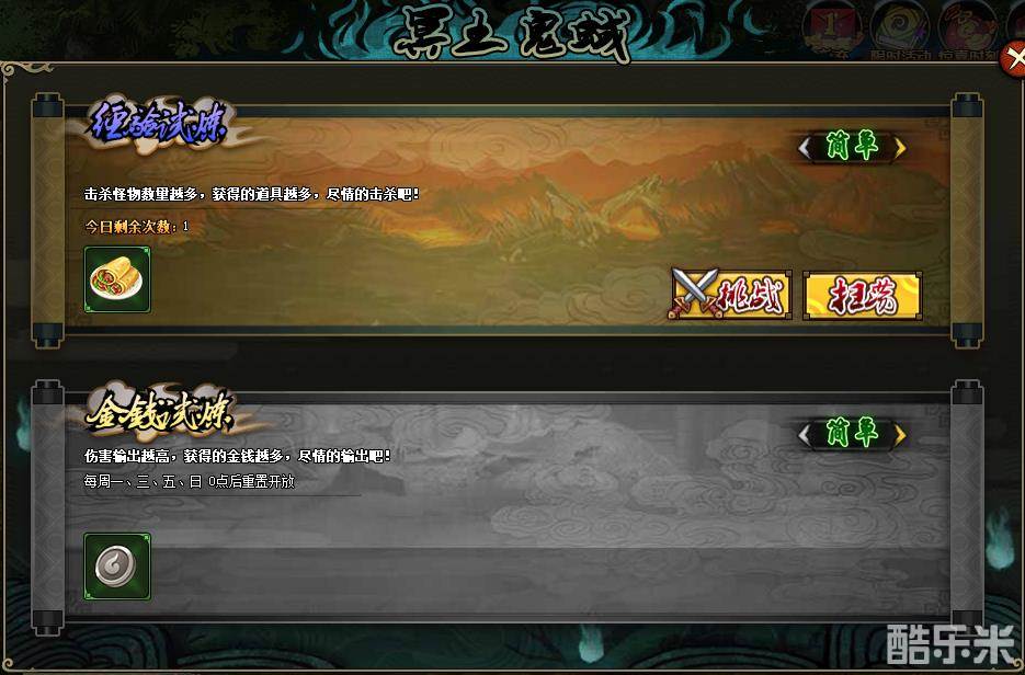 冥土鬼蜮是镇魂将的试炼之地,玩家挑战冥土鬼蜮可以获得大量银币和英雄升级道具。在冥土鬼蜮中有两个试炼活动,一个是经验试炼,一个是金钱试炼。两个试炼的试炼内容和试炼奖励都不同,玩家可以根据界面的提示进入试炼中。
