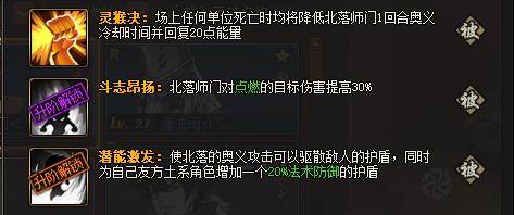 “斗志昂扬”是北落师门的二级被动技,可使他对点燃目标的伤害提高30%,是非常有用的增益技能。“潜能激发”是北落师门的第三被动技,可使他的奥义攻击拥有驱散敌人护盾的效果,同时能为同阵营的土系英雄提供一个20%法术防御的护盾。