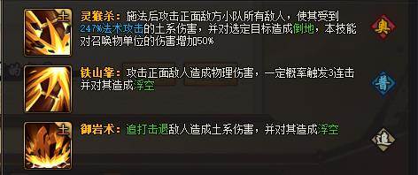 北落师门的奥义技能“灵猴杀”是一个群攻技能,可以攻击敌方所有敌人,对他们造成247%的超大法术伤害,并使其中的选定对象进入倒地状态。他的普攻技能“铁山靠”是很朴实的一招,可以攻击正面敌人造成物理伤害,并有一定概率触发3连击和造成浮空。“御岩术”是他的追打技能,需要在一定条件下才能触发,可以追加伤害和造成浮空。