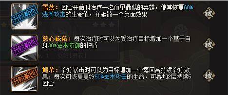 夏铃是水属性的武将,拥有不俗的治疗能力,在队伍中的定位是治疗辅助。主要的治疗技能是“灵光”,该技能对全体队友都有效。其次是“雪落”,可治疗队伍中血量最低的队友并驱散一个负面效果。然后还有一个“鸠杀”,可为目标附加一个每回合持续治疗的效果,并恢复自身50%攻击的生命值,最多可持续5回合。