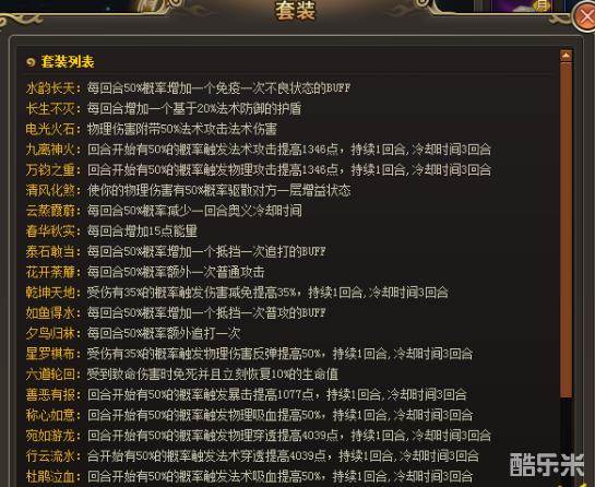 每一种套装都有不同的套装效果,有给玩家增加BUFF的,有增加玩家伤害的。根据玩家的需要玩家可以自行搭配套装命石,需要注意的是有一些命石的套装效果是有冷却时间的,也会有持续时间。
