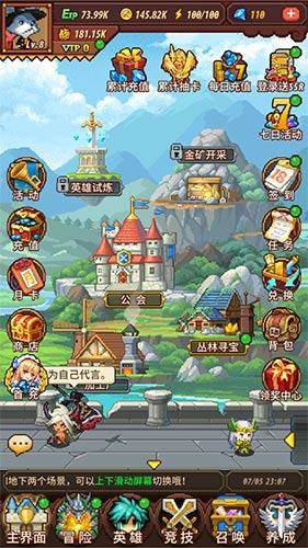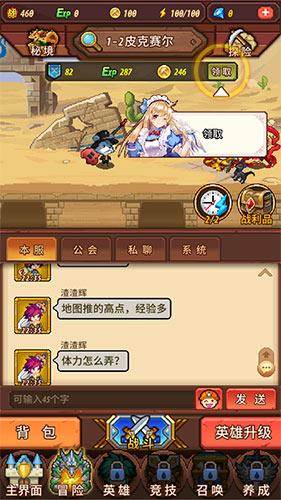 领取经验 素材可在战利品宝箱领取 游戏玩法方面,本作主要核心内容为副本章节关卡,讲述了玩家作为一名冒险家和公主一起去打到邪恶势力的大魔王的故事,主线任务非常简单,章节关卡将随玩家战力/等级提升而解锁。与此同时,本作还加入了英雄养成、丛林秘境、采集挖矿、世界BOSS、竞技之岛、公会副本、公会战、跨服战等一系列特色玩法内容,满足不同玩家的需求。