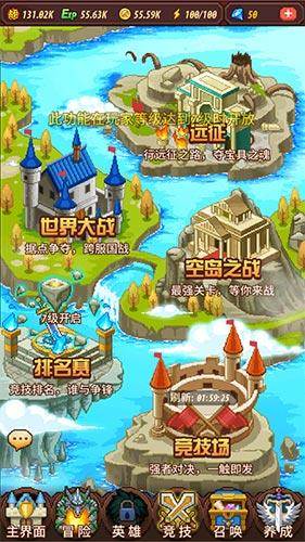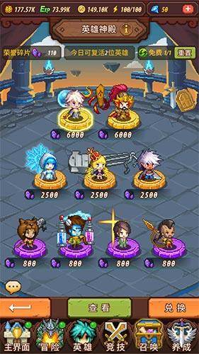 主界面场景 清新亮丽的像素世界 英雄角色:乱花渐欲迷人眼 200+角色实力强 作为游戏最大亮点没有之一,本作所收录的英雄角色应该说是笔者见过这么多游戏中品类最繁多(涉及古、今、中、外、神话故事界、历史界、动漫二次元界等诸多领域)、数量最庞大(超过200名可选角色,竟然还在更新添加中!)的像素类手游作品了。对于各位非氪金流玩家来说,想要完全收集这些角色,还是需要花上些许时间的,有“Money之力”的超能力玩家可忽略。好在游戏中,玩家获取英雄的途径并不只是一种,除了钻石抽卡外,玩家还可以使用友情点召唤英雄,用荣誉碎片(解雇英雄获得)在英灵神殿复活英雄,或是使用奥数法杖定向召唤自己想要的流派型英雄。