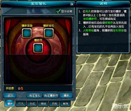镶嵌:在已有孔的装备上进行宝石镶嵌,镶嵌4级以上(含4级)宝石需要放入宝石镶嵌符,宝石镶嵌符分初级、中级、高级3种。