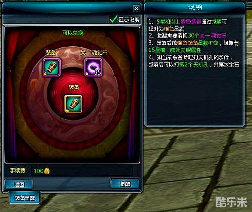 使用30个太一魂觉石可将9星以上紫色装备通过觉醒功能提升为橙色品质,觉醒后的橙色装备星数不变,但拥有15星星槽,且有额外天赐属性,并且觉醒后的装备可以打第2个天机孔,并镶嵌宝石。