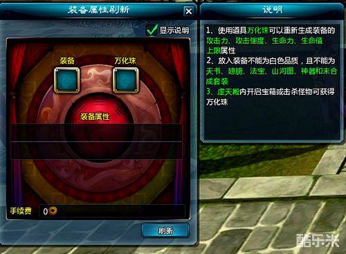 通过使用万化珠刷新装备的原始属性,重新生成装备的攻击力、攻击强力、生命力、生命值上限属性。