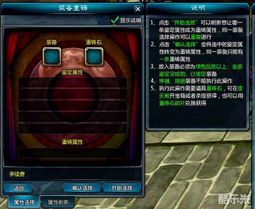 绿色品质以上、全部鉴定完成、并且绑定的装备即可以进行属性选择,属性刷新。属性选择需要使用重铸石,点击“开始选择”可以刷新想让哪一条鉴定属性成为重铸属性。属性刷新是对重新生成的重铸属性不满意可进行再度刷新,刷时新需要放入“幸运石”和初级或高级的点晴石。