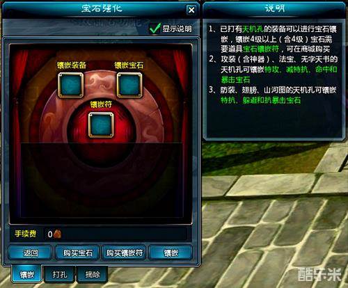 镶嵌:对已打有天机孔的装备进行宝石镶嵌。攻装(含神器)、法宝、无字天书的天机孔可镶嵌特攻、减特抗、命中和暴击宝石。