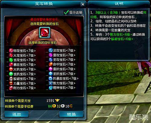 3级及以上的宝石可以通过该功能将宝石转换成同价格、同等级的其它种类的宝石。