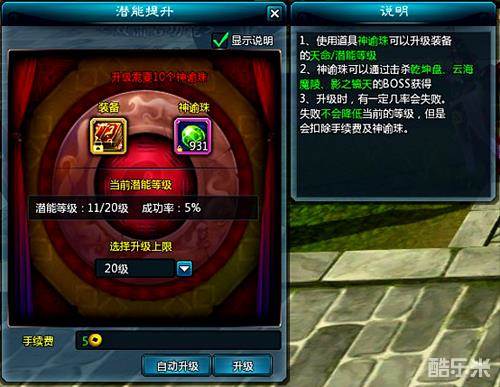 通过使用“神谕珠”可以将装备上的“天命、潜能等级”进行提升,最高可提升至20级,随着等级的提升每次消耗的神谕珠数量及提升成功的几率均不同。