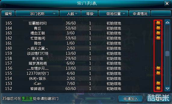 P键打开宗门界面,选择后面标有“招”字的宗门,点击申请加入,然后等待审核即可。
