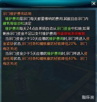 当宗门资金不足以支撑10天的宗门维护费用时,宗门内一切经验活动奖励降低20%,且所有宗门商店自行关闭;当宗门资金不足以支撑5天的宗门维护费用时,宗门内一切经验活动奖励将降低40%,且所有宗门商店自行关闭;当宗门资金不足以支撑1天的宗门维护费用时,宗门将在隔天的24时解散,请各位宗主密切关注本宗资金情况,及时补充资金维持宗门。