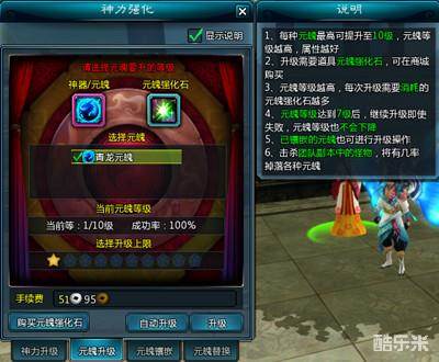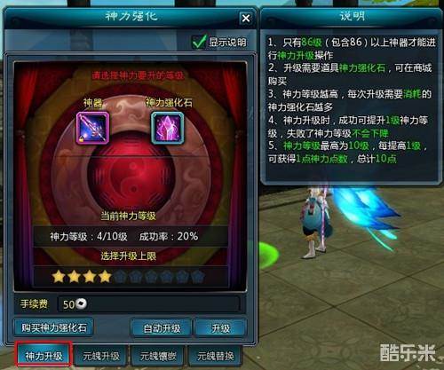 每把神器都拥有1级的初始神力等级,前往凌霄城NPC“黄悦玲”处选择“神力升级”选项,使道具“神力强化石”便可提升神器的神力等级,神力等级上限10级,道具“神力强化石”在10人团队副本“芦笛洞”、“福禄洞”中产出。神力等级每升1级神器点数增加1点,每把神器的神力点数上限为10点。