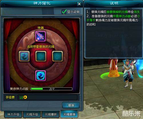 由于神力点数的限制,每把神器可镶嵌的元魄数量有限,当获取更加优质、或者属性更加理想的元魄时,可对原有的元魄进行替换操作。