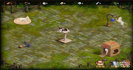 买道具,然后在点“布置”按钮,将道具一件一件拖入草坪摆放即可。道具共分为5种,有猫爬架、猫垫子、