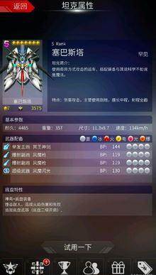 在机战坦克中塞巴斯塔小编个人觉得还是非常不错的,首先看看武器系统及基本耐久,这耐久还算不错,底盘感觉也挺牛逼的样子。主炮~冥王神剑很帅气吧?一定距离无限直线贯穿且拥有短期极强控制力被打中至少得掉(此处以基本上海计算)85*8,最好可以擦出85*12。缺点:飞得很慢,距离太短伤害感觉很不错,问题是如何打中敌人当然这里还有一个猜测,这主炮可以破盾,这当然不是凭空捏造的,可是有依据的哦,具体嘛,有待实测。