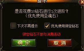 注意:无论进阶或者高级进阶,第一次点击会弹出类似这个提示,如果勾选了下次不在提示,那么圣魂石不足时,再进阶会自动消耗钻石。