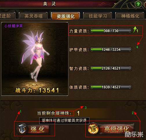 4、一点资质需要消耗凝神珠一个,强化时随机分配到四个属性中的一个;