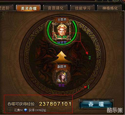 1、英灵吞噬只能继承经验,花费钻石能百分百继承全部经验,价格不变;