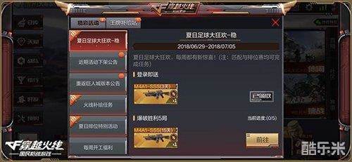 CF手游“夏日足球大狂欢”活动持续进行中,本周登录即领M4A1-SSS(3天),活动期间玩家爆破模式胜利5局,就能100%获得M4A1-SSS(15天)。7月6日起,玩家登录游戏还能获得其它同品质神器,具体内容敬请期待。