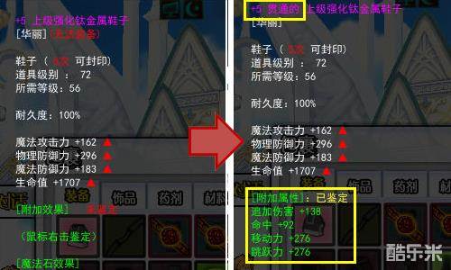 玩家在游戏内制作、副本掉落或宝箱内获得道具均属于无鉴定装备,玩家可右键装备进行鉴定,鉴定同时将随机赋予装备属性,根据附加效果在道具前增加修饰语。未鉴定的装备不可打强化石、不可镶嵌魔法石等(可交易、出售、分解、使用强化卷进行强化)。