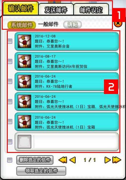 区域1:邮件条目清单,邮箱中所有存在的邮件会在此显示。显示的主要信息有邮件名称、邮件发送人、邮件附件等。其中邮件又分为系统邮件、一般邮件以及请帖邮件三类,系统邮件为系统发送给玩家的邮件,一般邮件为玩家之间发送的邮件,请帖邮件为其他玩家结婚发放的邀请函可在此领取。