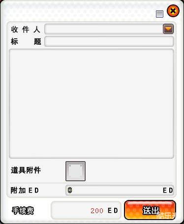 点击主菜单的发送邮件后可以进行发送邮件操作,发送邮件所需要填写的内容主要有收件人(可通过下拉单来直接选择好友)、邮件标题、邮件内容、道具附件、附加ED(游戏金钱)。