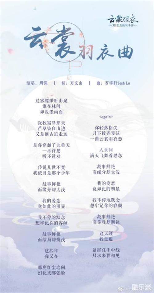 随着由西山居研发、腾讯游戏代理发行的3D恋爱换装精品手游《云裳羽衣》的不删档到来,由中国风鼻祖方文山老师的‘诗情’加上周深天籁美声的‘画意’演唱的游戏主题曲《云裳羽衣曲》也上架“QQ音乐”,引得玩家粉丝一众好评。据官方消息透露,周深将带着这首唯美空灵的《云裳羽衣曲》,亲临7月8日在北京三里屯举办的《云裳羽衣》手游发布会与体验店开幕仪式进行首唱,非常值得期待!