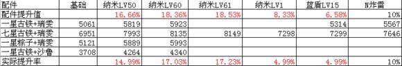 测试护盾装甲时实际结果跟配件说明并不相符,不知是护盾装甲的数值显示错误还是另有计算公式,反正我算出来纳米装甲实际应该是基础加5%耐久,每级提升0.2%。蓝盾我懒得测试了。