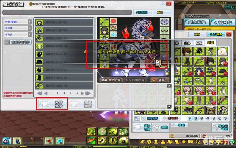 2、点击魔法衣橱UI下方的“外形登录”按钮,选择想要登录外形的时装或装备;