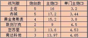 再来说说她的输出方面,土佐具备五门主炮。以往的五炮战列舰主炮填装时间都比较长,以平衡她们的输出。而土佐和她们不一样,她拥有五门主炮,同时主炮填装时间还很短,只有16秒!这样算下来,平均每一炮的CD只有3.2秒。这里我来说一下我们目前比较主流的战列舰主炮均CD: