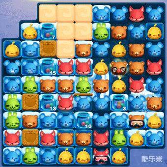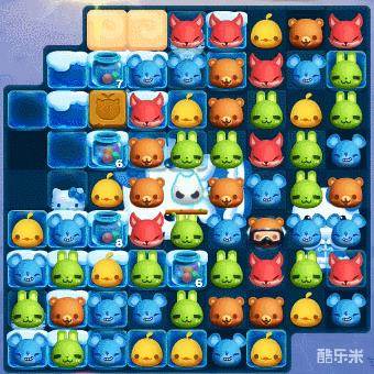 2、每次开局后,kitty所在的位置是随机的,但最大的一只必然藏在棋盘最中间,占据五乘三的格子。这里有四个水晶罐阻碍,我们必须消除水晶罐,才能消除其下的冰块,才能近一步收集这只最大的kitty。所以有机会,还需尽量优先消除靠近中间的四个水晶罐。