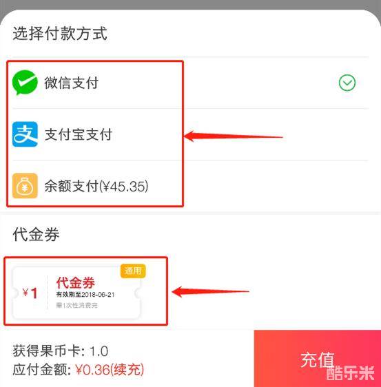 5.点击右下方“充值”按钮后,选择付款方式,若有代金券,则选择代金券。
