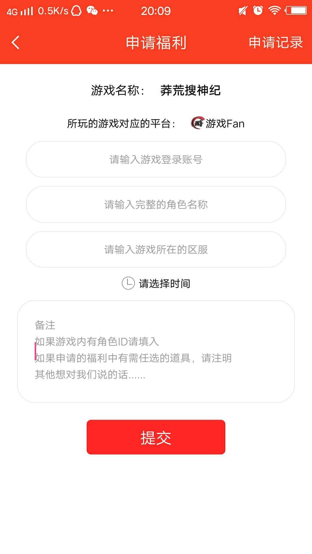 点击“申请福利”按钮,填写账号、角色名、区服,选择需申请的类型(若有),选择参与日期(若有),点击提交;