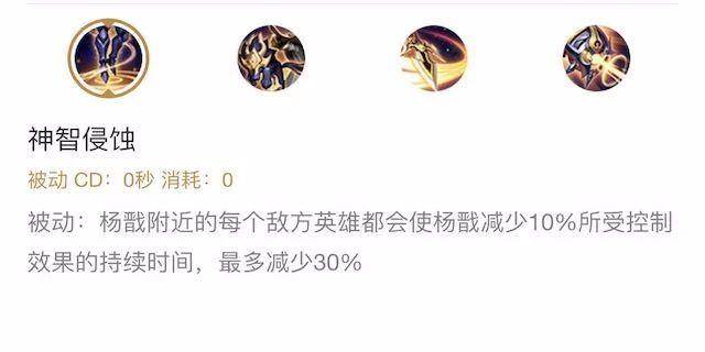解析:根据敌方英雄的数量,可以减少杨戬受到控制效果的持续时间。这个被动技能,配合上抵抗之靴,让敌人的控制技能在杨戬的身上持续时间大大降低,例如墨子的二技能,后羿的大招等。但是值得注意的是,如果被例如达摩苏烈等大招击飞,击飞距离是不会缩短的,只是眩晕时间会减少。