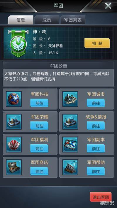 军团科技的提升也主要靠捐献,捐献规则同军团主等级,每天每种资源2次就好。