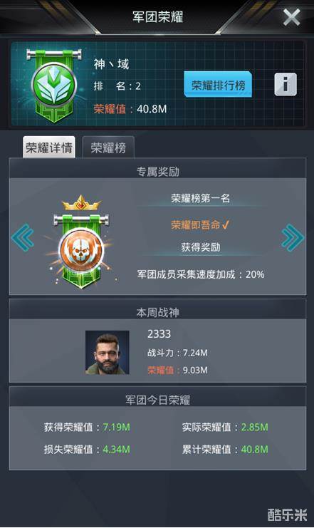 军团荣耀能体现一个军团的凝聚力。攻击其他玩家胜利就能获得荣耀值,但是如果受到攻击失败也会减少荣耀值。每周荣耀榜前三成员的采集速度都会增加,第一名加20%,第二名10%,第三名5%。同时每周前三成员在周日都能获得结算奖励,非常划算。故而加个强力军团就显得非常重要。