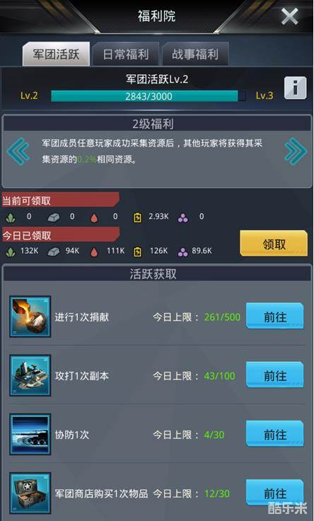 军团福利和军团活跃挂钩,军团活跃有5级,每提升1级就能获得更高的福利,军团玩家可以获得其他军团玩家采集量的0.2%-1%的量。除此之外,还有每天福利,能获得科技点和技能书,都是非常实用的东西。但是福利必须入团24小时才能领取。还有储放战事奖励物品。