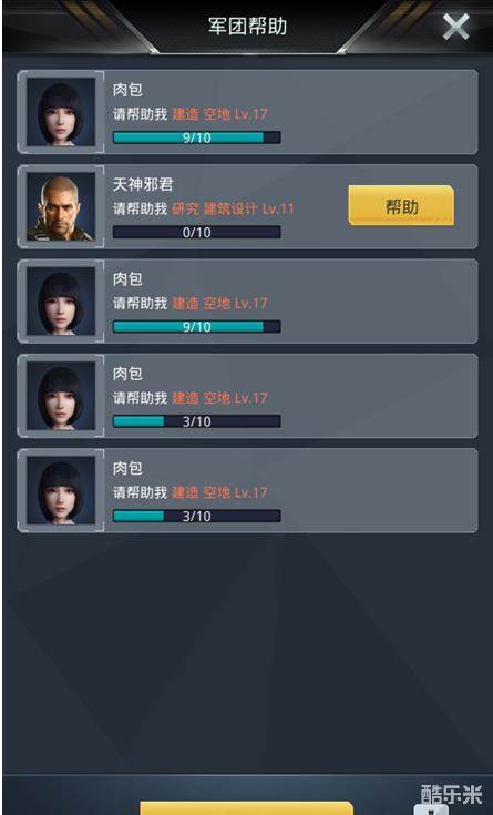 军团帮助也是军团非常重要的福利,发出请求后,军团成员能帮助你加快军团建筑速度。如果满帮助的话,1个小时的建筑能加速近1半的速度,大大加快建筑速度。故而前期一定要选择活人军团,这样才能获得大量帮助。