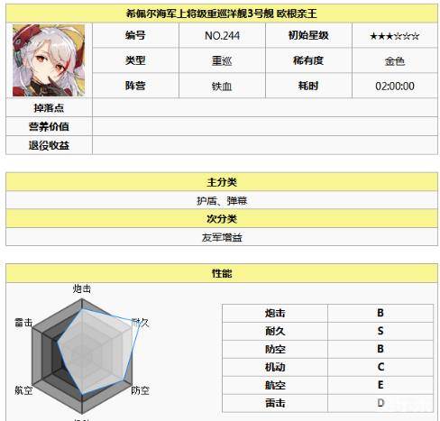 在游戏中,欧根亲王重巡是希佩尔海军上将级重巡洋舰3号舰,血量厚度很高的T,万能搭配,技能给先锋舰队强力保护,前提是你要牺牲一个输出位。