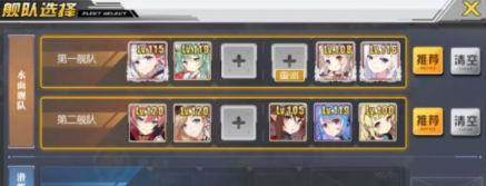 1队道中,2队BOSS,1队刷全图时候旗舰注意血量,血太低时候可以将补给放旗舰位,等级要求,100即可(笔者因为百级的船都远征去了,就不换成百级船截图了~)
