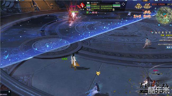 曲盟主的试炼被安排在移花群岛最高峰,战斗场地呈圆形,会在进入战斗后被分割为两个半圆区域:星辉以及普通区域,同时根据站位为所有参战玩家附加“仰望星空”、“沐浴星辉”两种特殊状态,携带“仰望星空”状态的玩家只能在普通区域活动,一旦越界进入星辉区域将持续承受伤害,且无法对星辉区域内的星相蜃影造成伤害;同理,携带“沐浴星辉”状态的玩家只能在星辉区域内活动,且无法对曲无忆本体造成伤害,两种状态都会以异常状态的形式显示在内息条上方。