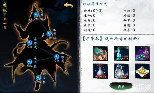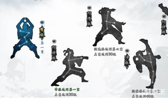 蓝色经脉小人即为已解锁的经脉,灰色则为未解锁,小人下方的文字表示解锁条件,其中灰白色文字为未达成条件,全部达成即可解锁该条经脉,点击已解锁的经脉即可进入相关升级界面。