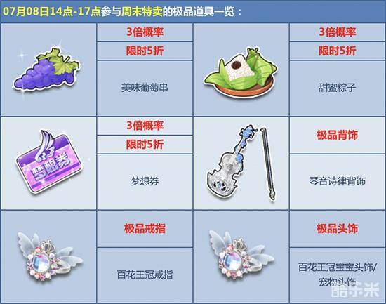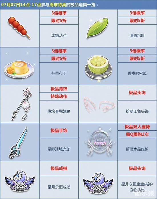 7月7日-8日期间固定时间段,人气道具【冰糖葫芦】、【清香粽叶】、【芒果布丁】、【甜蜜粽子】等人气道具限时5折低价出售,更有3倍极品爆率。