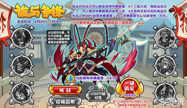 大家需要挑战吕布和三国武将们,每挑战一个三国武将成功都可以增加神勇徽章的掉落几率,六个武将都点亮后就可以100%掉落徽章了。